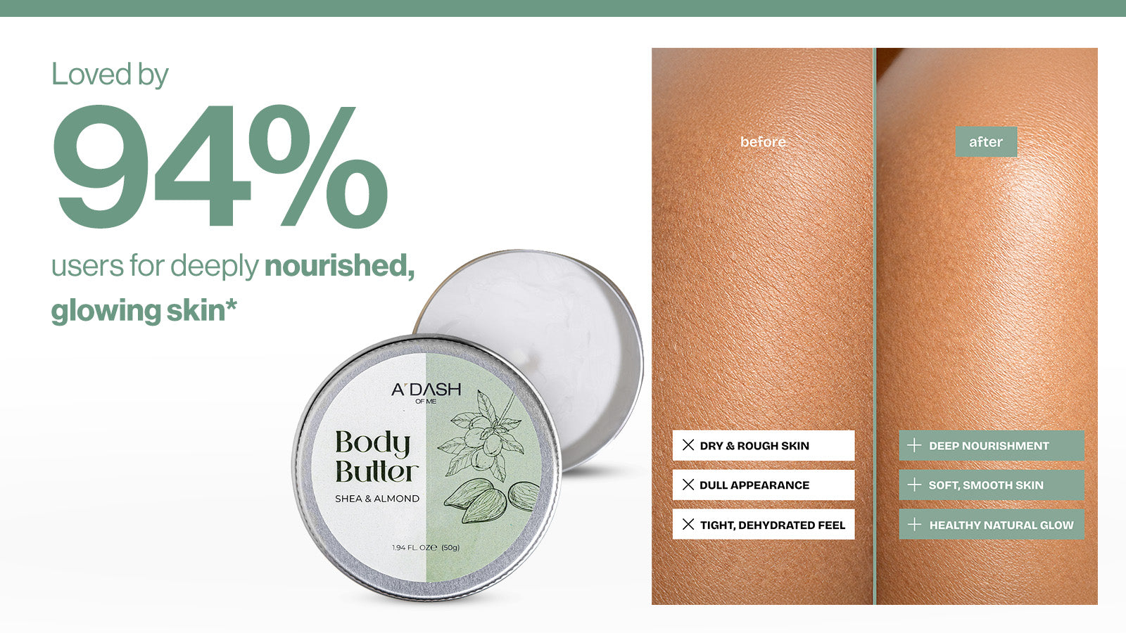 Shea Butter and Coconut Oil deeply moisturize and lock in hydration, helping even the driest areas feel soft, smooth, and supple.