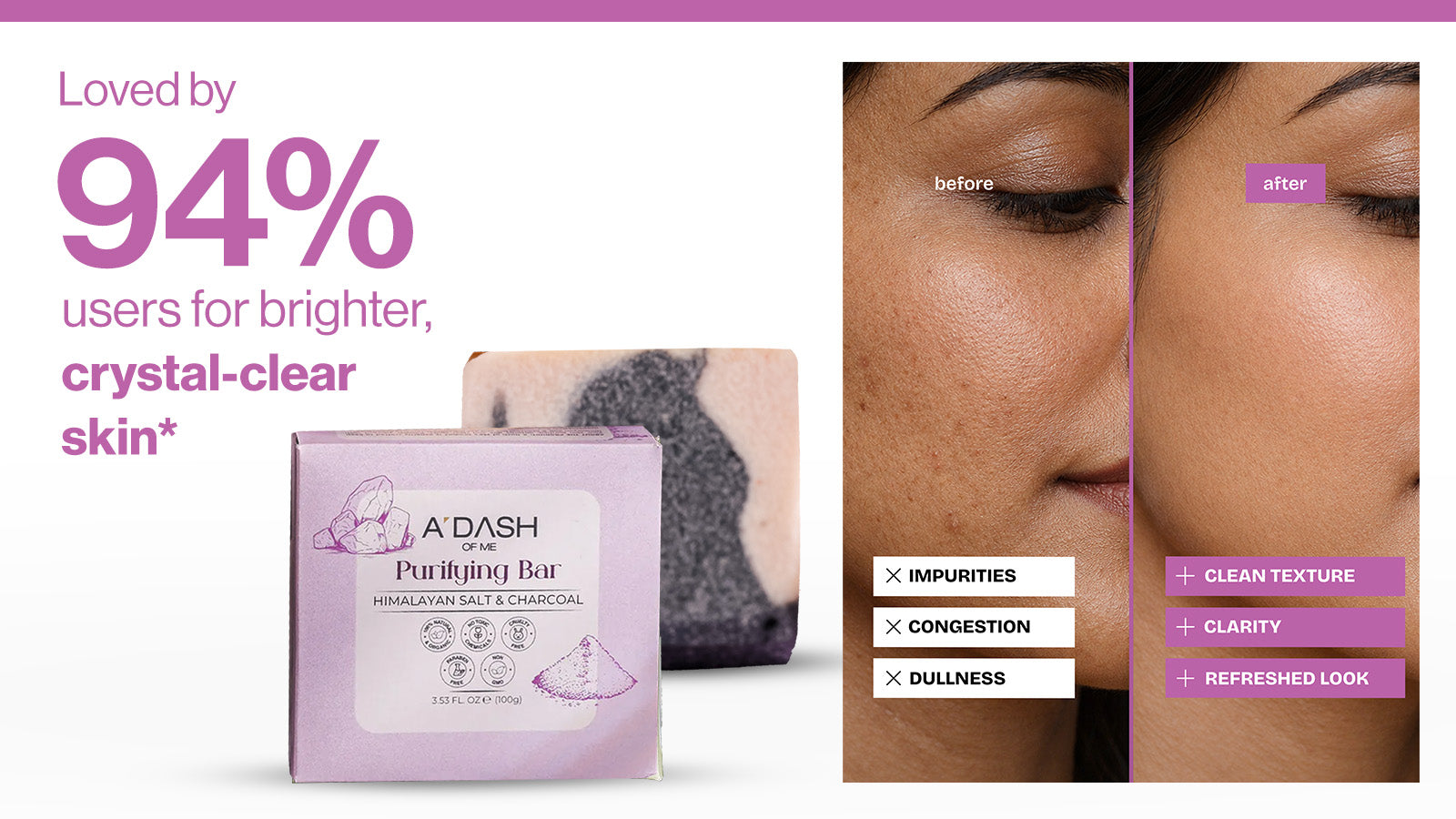 Himalayan pink salt and activated charcoal work together to draw out impurities, absorb excess oil, and help reduce congestion for clearer skin.